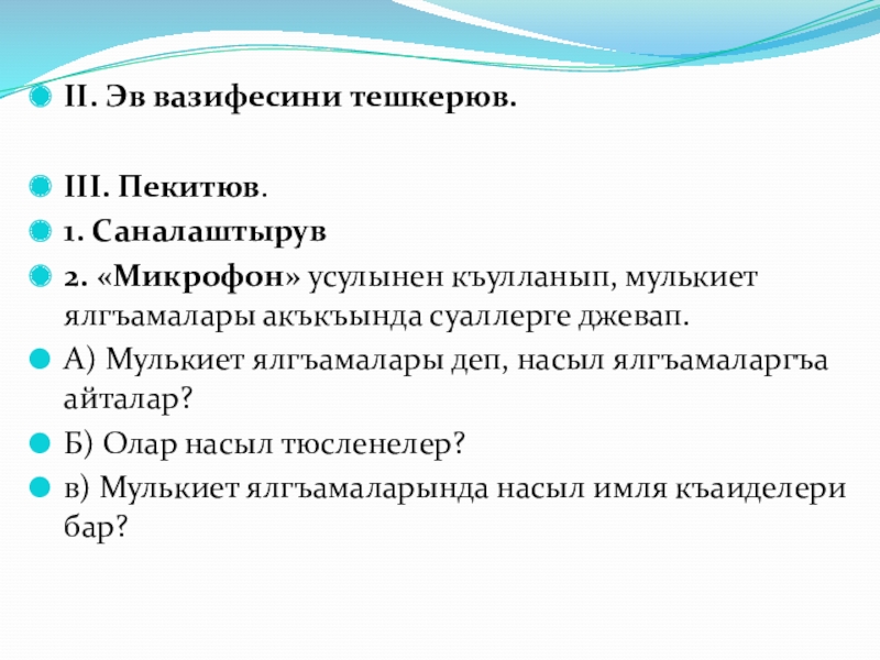 II. Эв вазифесини тешкерюв.III. Пекитюв.1. Саналаштырув2. «Микрофон» усулынен къулланып, мулькиет ялгъамалары акъкъында суаллерге джевап.А) Мулькиет ялгъамалары деп,