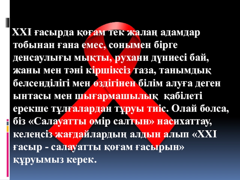 сонымен бірге денсаулығы мықты, рухани дүниесі бай, жаны мен тәні кіршіксіз таза, танымдық белсенділігі мен өздігінен білім алуға деген ынтасы мен шығармашылық қабілеті ерекше тұлғалардан тұруы тиіс. Олай болса, біз «Салауатты омір салтын» насихаттау, келеңсіз жағдайлардың алдын алып «XXI ғасыр - салауатты қоғам ғасырын» құруымыз керек.