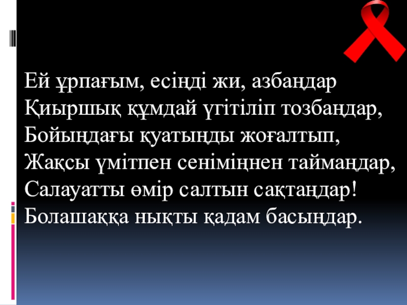Ей ұрпағым, есіңді жи, азбаңдарҚиыршық құмдай үгітіліп тозбаңдар,Бойыңдағы қуатыңды жоғалтып,Жақсы үмітпен сеніміңнен таймаңдар,Салауатты өмір салтын сақтаңдар!Болашаққа нықты
