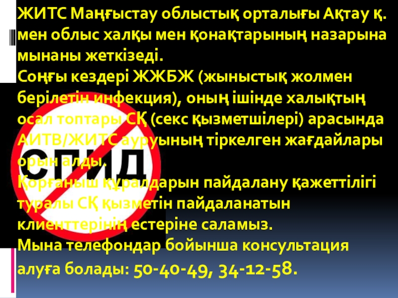 назарына мынаны жеткізеді. Соңғы кездері ЖЖБЖ (жыныстық жолмен берілетін инфекция), оның ішінде халықтың осал топтары СҚ (секс қызметшілері) арасында АИТВ/ЖИТС ауруының тіркелген жағдайлары орын алды. Қорғаныш құралдарын пайдалану қажеттілігі туралы СҚ қызметін пайдаланатын клиенттерінің естеріне саламыз. Мына телефондар бойынша консультация алуға болады: 50-40-49, 34-12-58.
