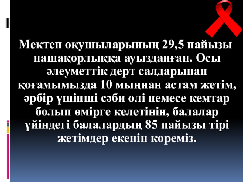 Слайд 6 Мектеп оқушыларының 29,5 пайызы нашақорлыққа ауызданған. Осы әлеуметтік дерт салдарынан