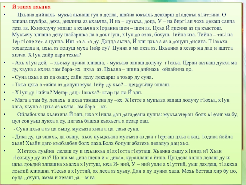 - Ахь х1ун дей, – хьоьху цунна элпаша, - мукъаза элпаш долучу г1охьа. Церан аьзнаш дукха ма ду, хьуна а кхача там бара- кх цхьа аз. Цхьана – шина дийнахь ойлайина цо.