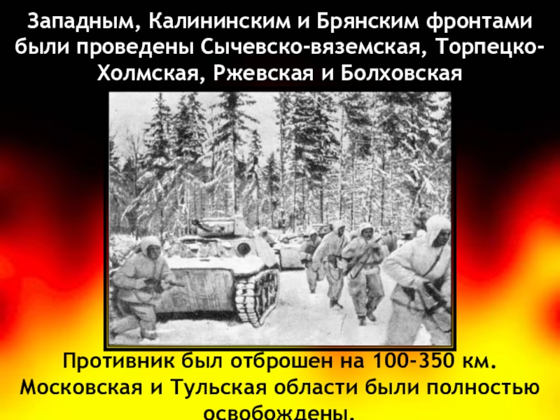 Западным, Калининским и Брянским фронтами были проведены Сычевско-вяземская, Торпецко-Холмская, Ржевская и Болховская наступательные операции.