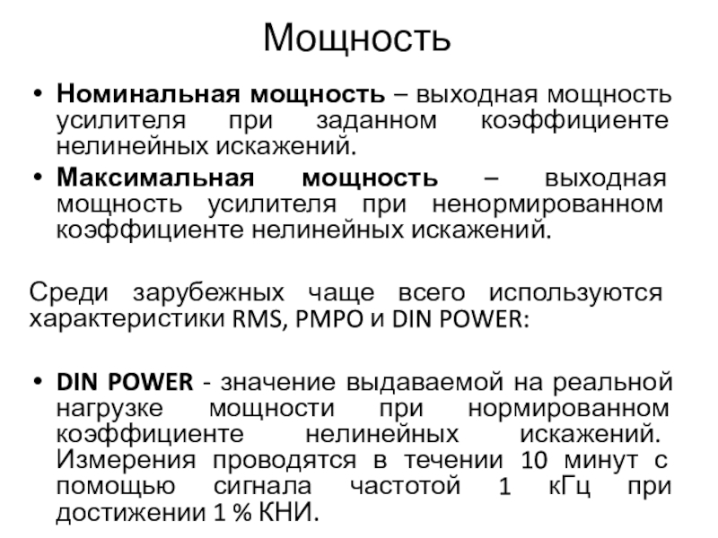 Среди зарубежных чаще всего используются характеристики RMS, PMPO и DIN POWER: