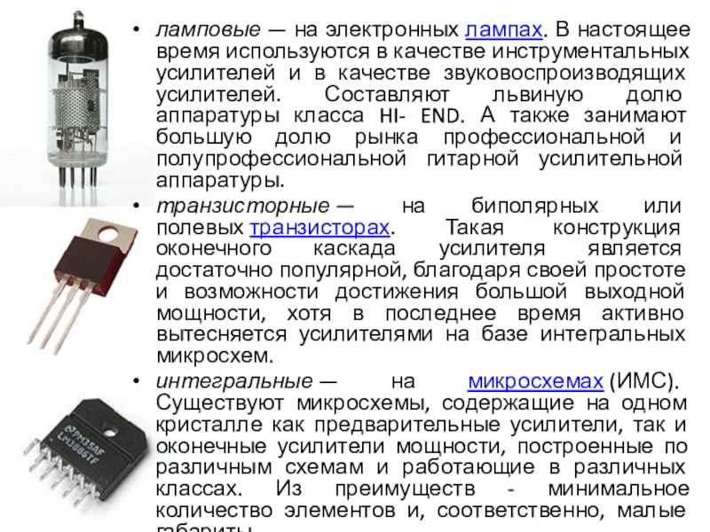 усилителей и в качестве звуковоспроизводящих усилителей. Составляют львиную долю аппаратуры класса HI- END. А также занимают большую долю рынка профессиональной и полупрофессиональной гитарной усилительной аппаратуры.