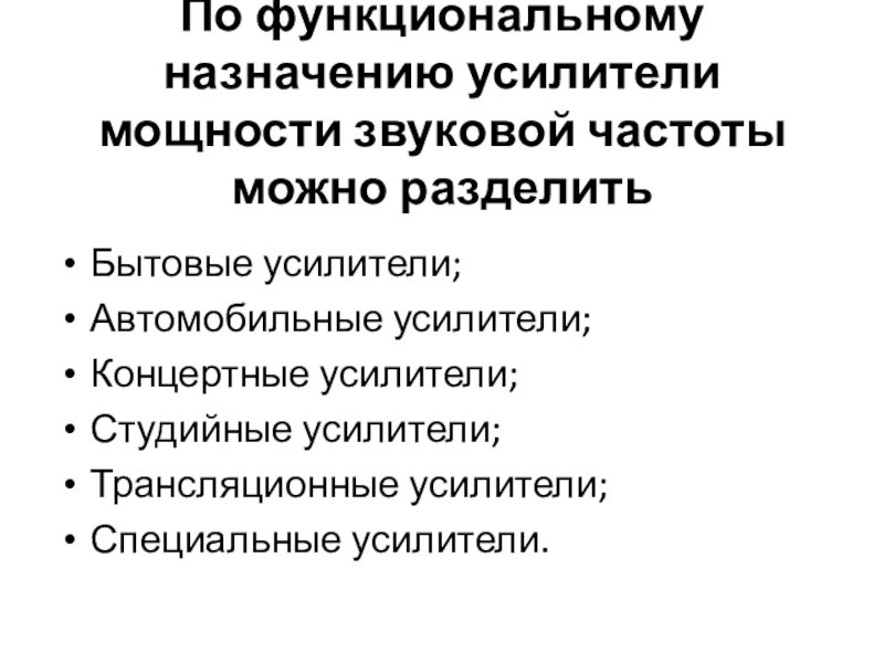Слайд 5По функциональному назначению усилители мощности звуковой частоты можно разделить