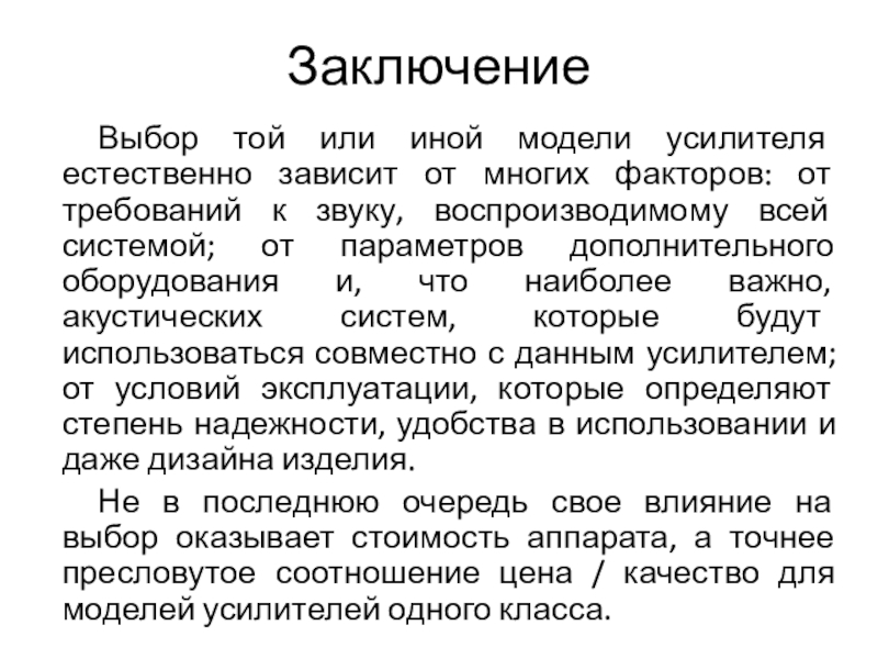 от требований к звуку, воспроизводимому всей системой; от параметров дополнительного оборудования и, что наиболее важно, акустических систем, которые будут использоваться совместно с данным усилителем; от условий эксплуатации, которые определяют степень надежности, удобства в использовании и даже дизайна изделия.