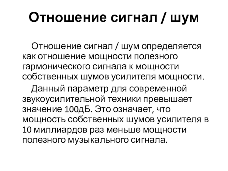 Данный параметр для современной звукоусилительной техники превышает значение 100дБ. Это означает, что мощность собственных шумов усилителя в 10 миллиардов раз меньше мощности полезного музыкального сигнала.