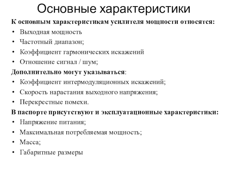 Основные характеристики усилителей (мощность, коэффициент нелинейных искажений, частотный диапазон)