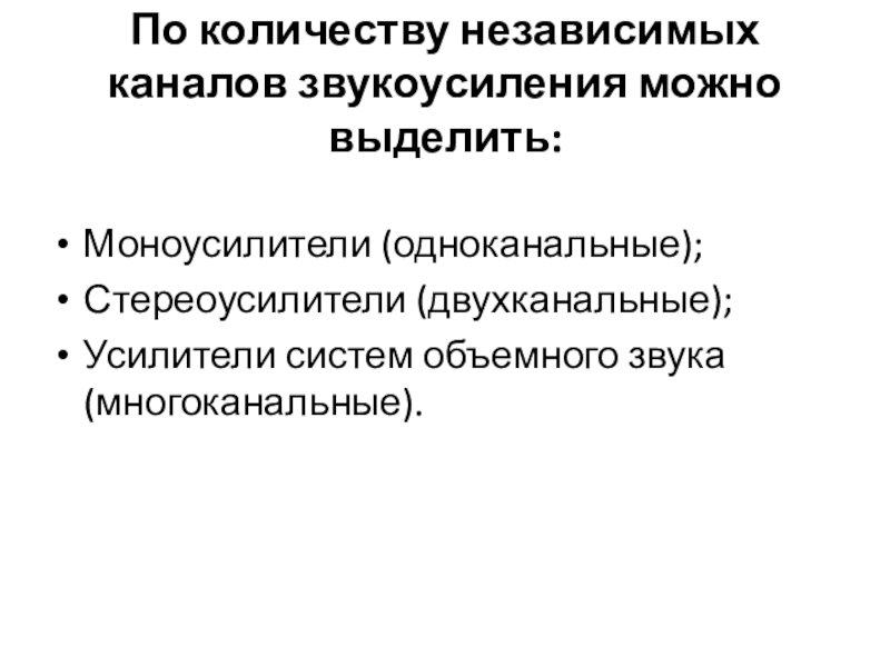 Слайд 16По количеству независимых каналов звукоусиления можно выделить: