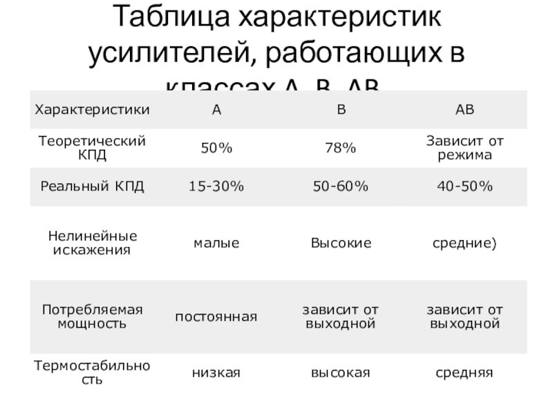Слайд 7Таблица характеристик усилителей, работающих в классах A, B, AB.