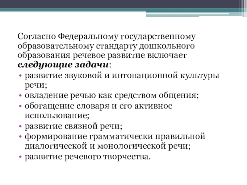 Слайд 3Согласно Федеральному государственному образовательному стандарту дошкольного образования речевое развитие включает следующие