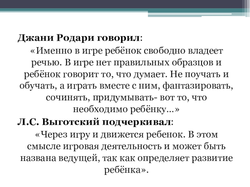 «Через игру и движется ребенок. В этом смысле игровая деятельность и может быть названа ведущей, так как определяет развитие ребёнка».