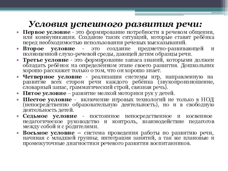 Восьмое условие – система проведения работы по развитию речи, начиная с младшей группы; интеграция занятий, а так же плановые и промежуточные диагностики речевого развития воспитанников.
