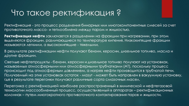Что такое ректификация ?Ректификация - это процесс разделения бинарных или многокомпонентных смесей за счет противоточного массо- и теплообмена между паром и жидкостью.Ректификация нефти заключается в разделении на фракции при нагревании, при этом выделяются фракции, различающиеся по температуре