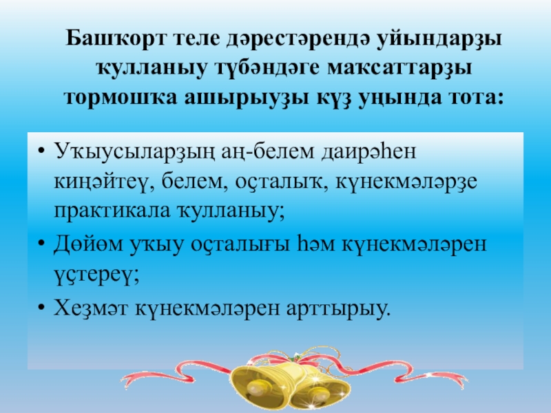 Уҡыусыларҙың аң-белем даирәһен киңәйтеү, белем, оҫталыҡ, күнекмәләрҙе практикала ҡулланыу;