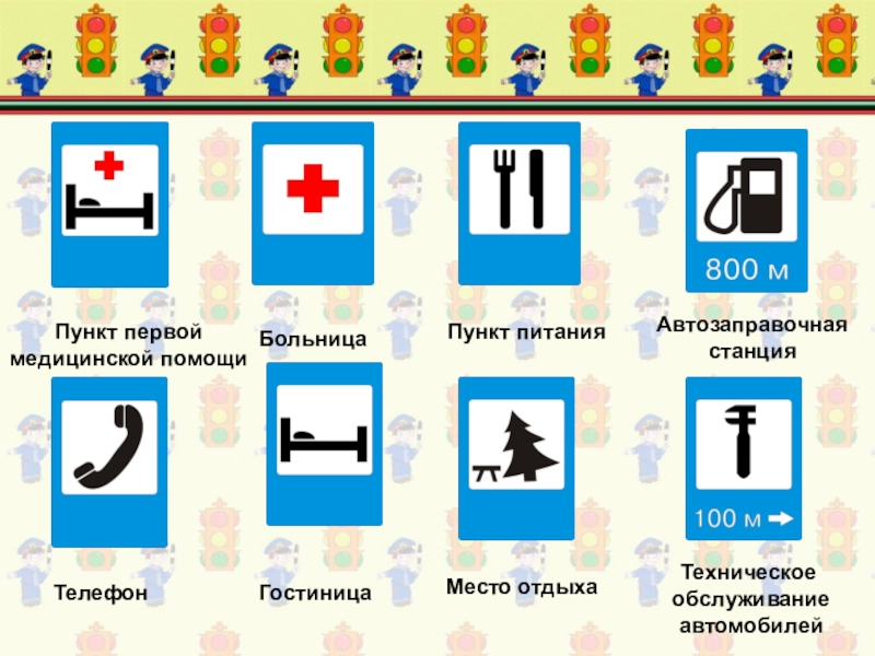 Пункт первой медицинской помощиБольницаПункт питанияАвтозаправочная станцияТелефонГостиницаМесто отдыхаТехническое обслуживание автомобилей
