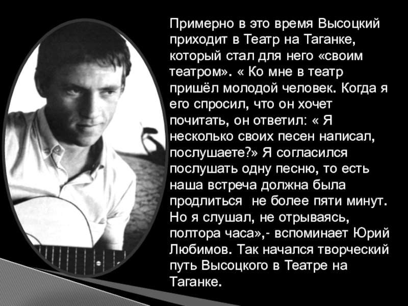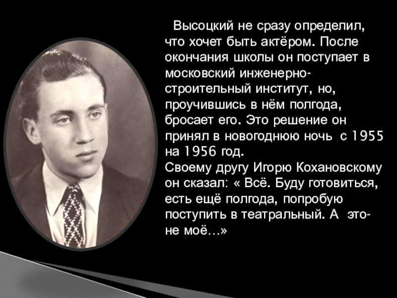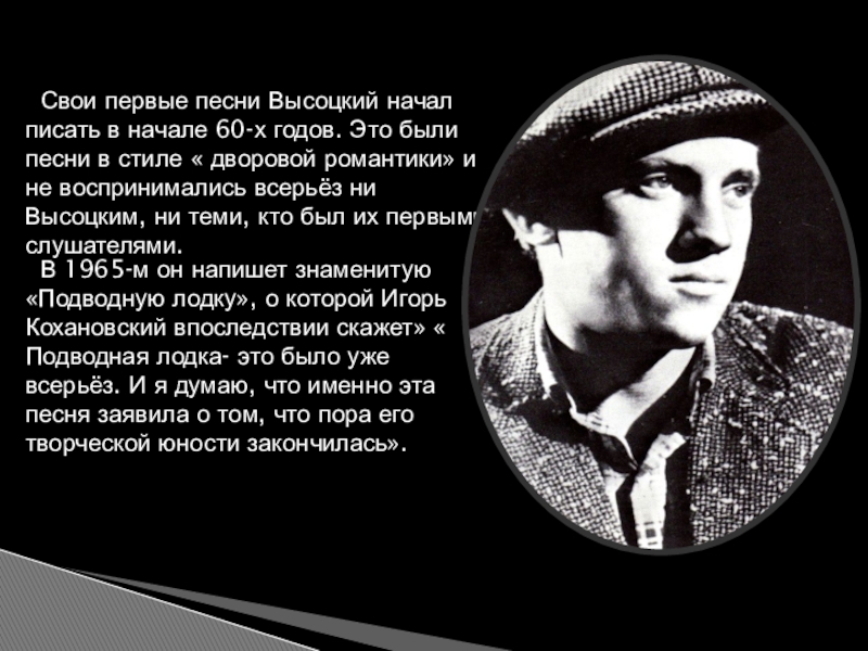 В 1965-м он напишет знаменитую «Подводную лодку», о которой Игорь Кохановский впоследствии скажет» « Подводная лодка- это было уже всерьёз. И я думаю, что именно эта песня заявила о том, что пора его творческой юности закончилась».