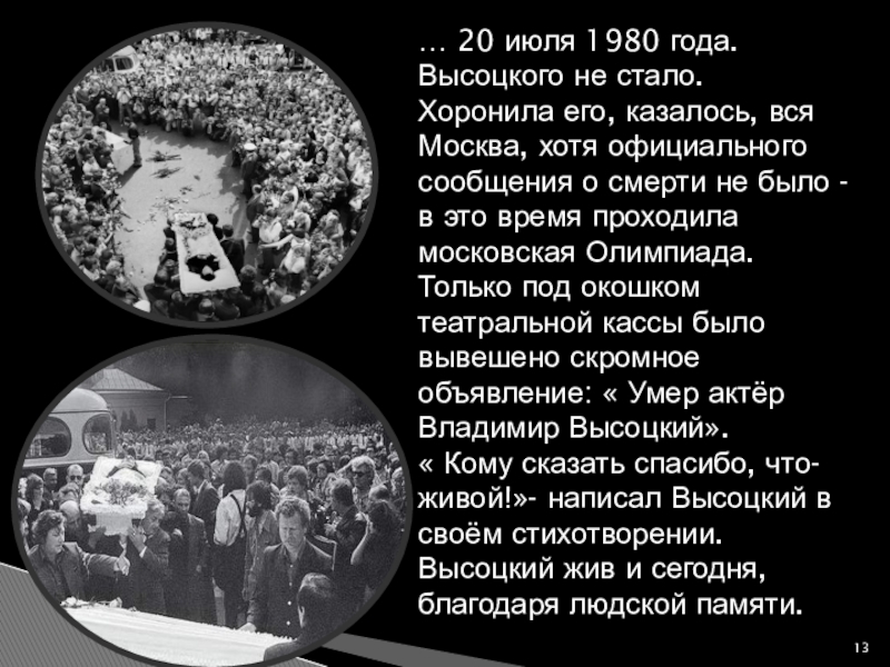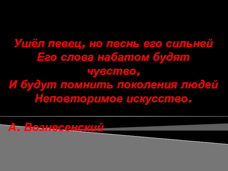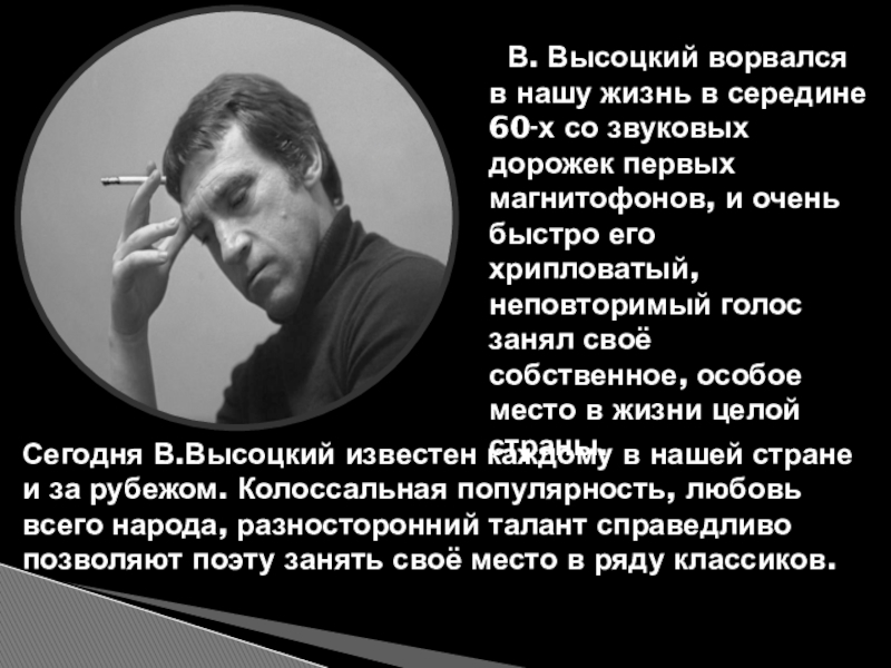 Сегодня В.Высоцкий известен каждому в нашей стране и за рубежом. Колоссальная популярность, любовь всего народа, разносторонний талант справедливо позволяют поэту занять своё место в ряду классиков.