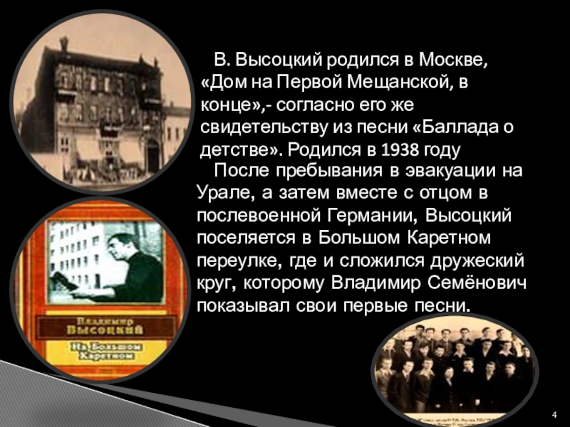 В. Высоцкий родился в Москве, «Дом на Первой Мещанской, в конце»,- согласно его же свидетельству из песни «Баллада о детстве». Родился в 1938 году