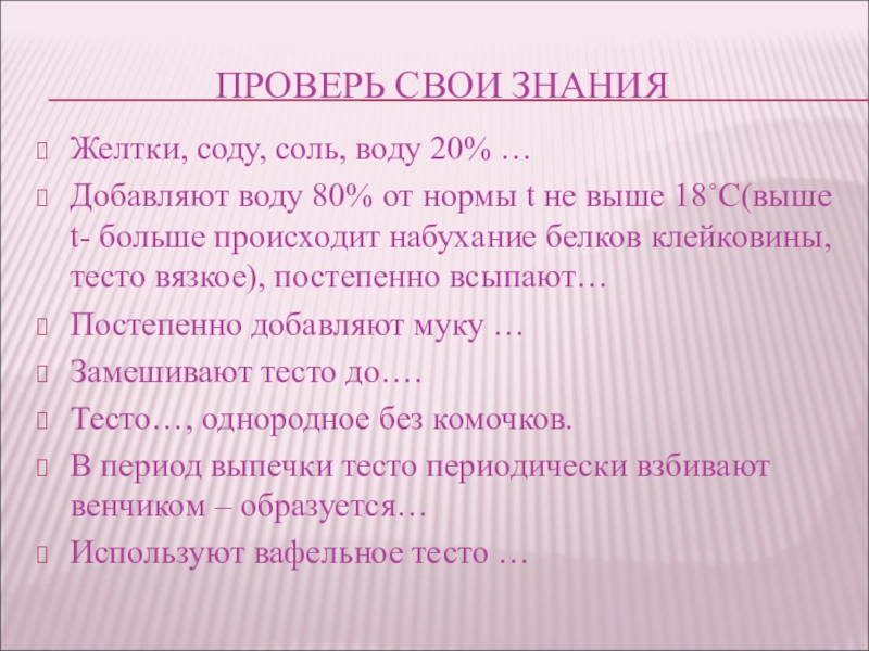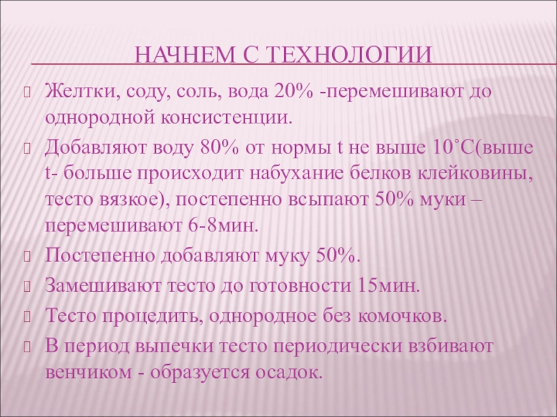нормы t не выше 18˚С(выше t- больше происходит набухание белков клейковины, тесто вязкое), постепенно всыпают…