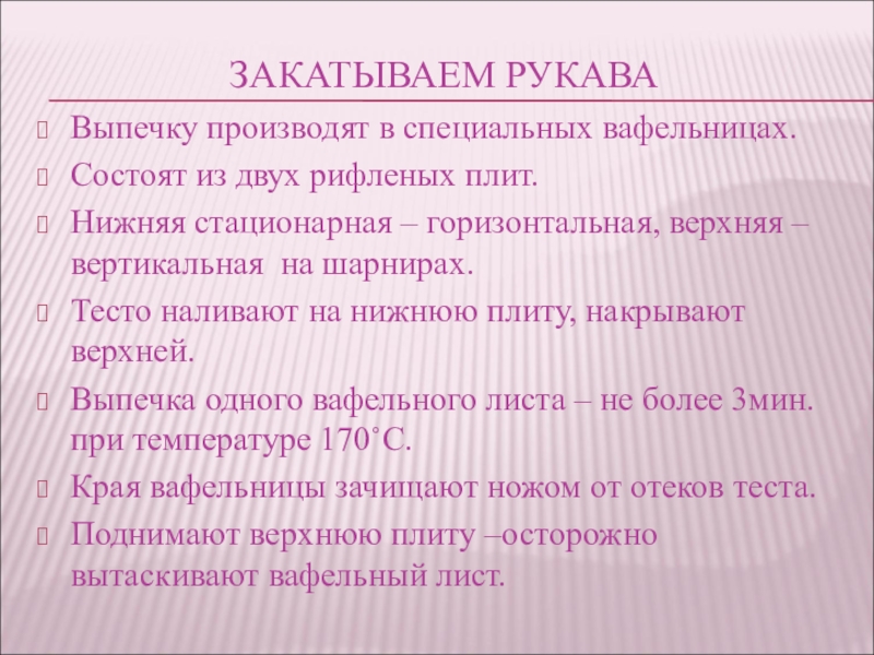 Выпечка одного вафельного листа – не более 3мин. при температуре 170˚С.