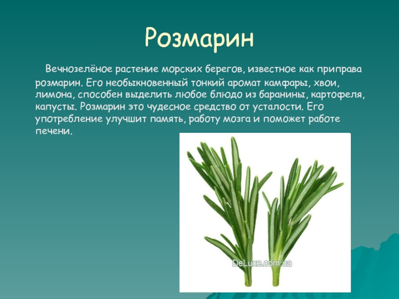 Его необыкновенный тонкий аромат камфары, хвои, лимона, способен выделить любое блюдо из баранины, картофеля, капусты. Розмарин это чудесное средство от усталости. Его употребление улучшит память, работу мозга и поможет работе печени.