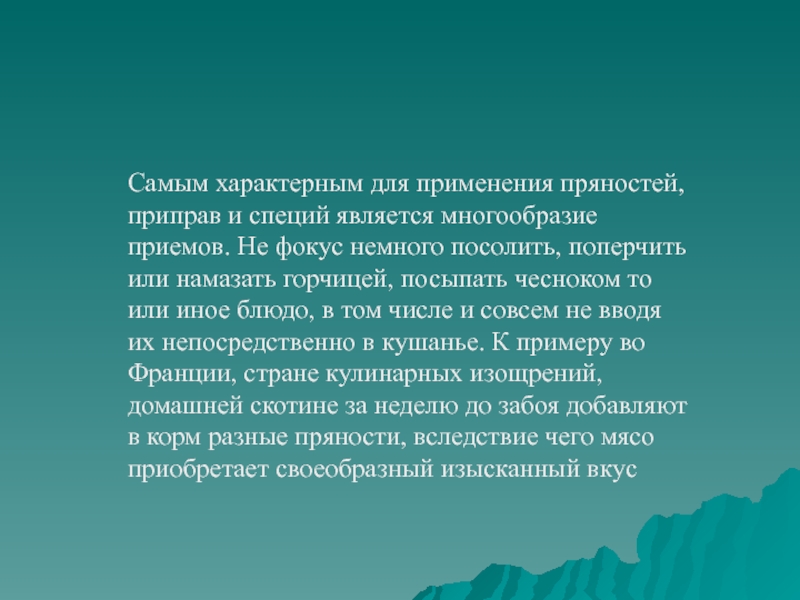 Слайд 12Самым характерным для применения пряностей, приправ и специй является многообразие приемов.