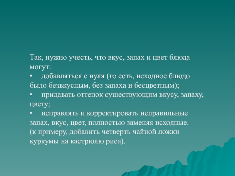 Слайд 16Так, нужно учесть, что вкус, запах и цвет блюда могут: