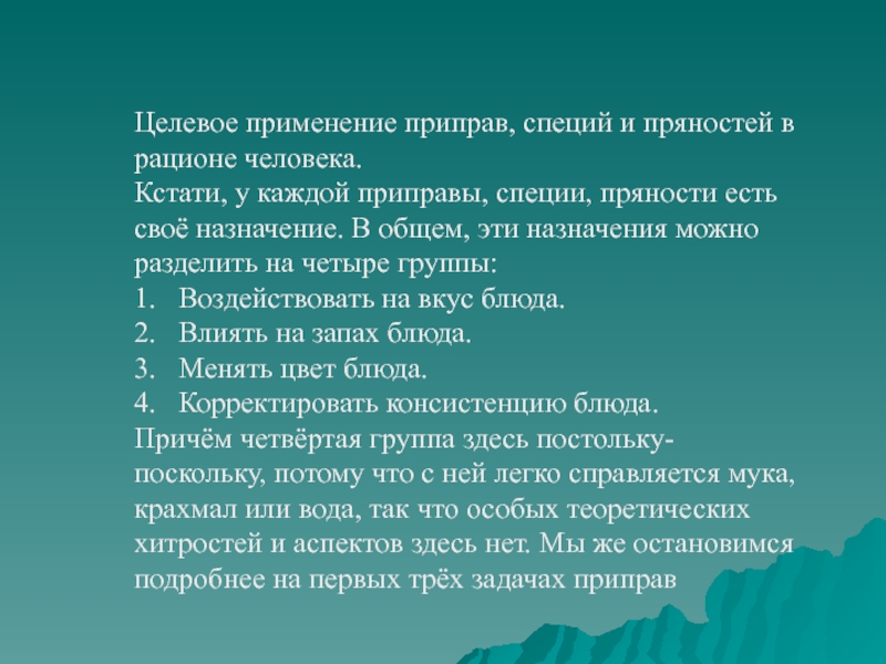 Слайд 15Целевое применение приправ, специй и пряностей в рационе человека.