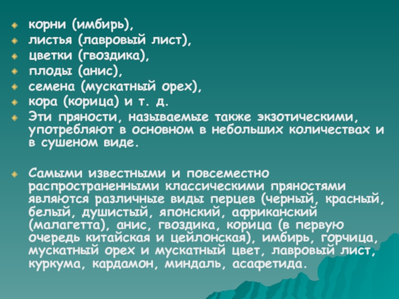 Эти пряности, называемые также экзотическими, употребляют в основном в небольших количествах и в сушеном виде.