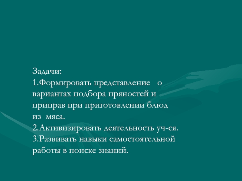 1.Формировать представление о вариантах подбора пряностей и приправ при приготовлении