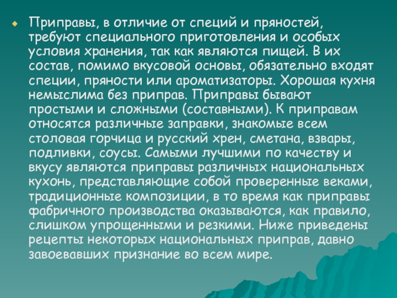 Слайд 24Приправы, в отличие от специй и пряностей, требуют специального приготовления и