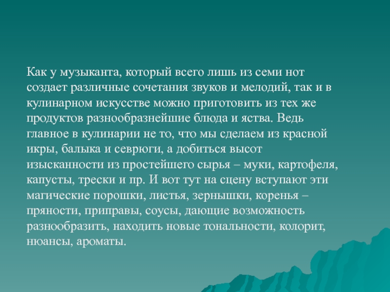 сочетания звуков и мелодий, так и в кулинарном искусстве можно приготовить из тех же продуктов разнообразнейшие блюда и яства. Ведь главное в кулинарии не то, что мы сделаем из красной икры, балыка и севрюги, а добиться высот изысканности из простейшего сырья – муки, картофеля, капусты, трески и пр. И вот тут на сцену вступают эти магические порошки, листья, зернышки, коренья – пряности, приправы, соусы, дающие возможность разнообразить, находить новые тональности, колорит, нюансы, ароматы.