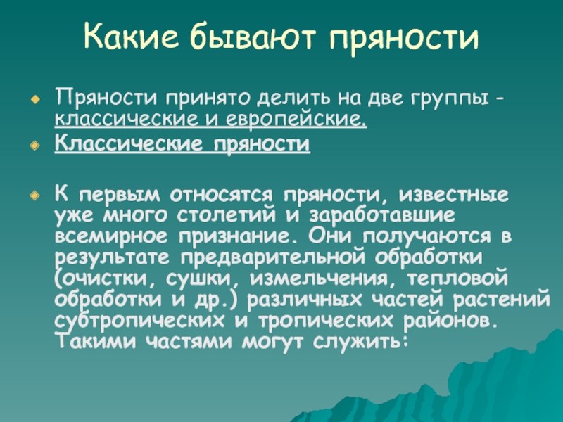 К первым относятся пряности, известные уже много столетий и заработавшие всемирное признание. Они получаются в результате предварительной обработки (очистки, сушки, измельчения, тепловой обработки и др.) различных частей растений субтропических и тропических районов. Такими частями могут служить: