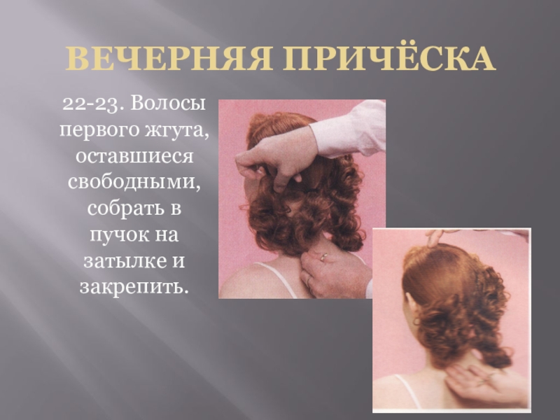 Вечерняя причёска22-23. Волосы первого жгута, оставшиеся свободными, собрать в пучок на затылке и закрепить.