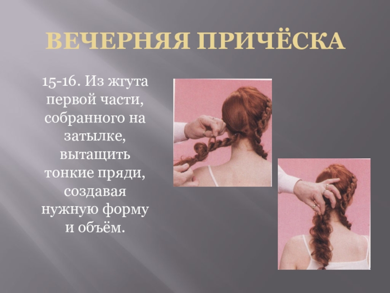 Вечерняя причёска15-16. Из жгута первой части, собранного на затылке, вытащить тонкие пряди, создавая нужную форму и объём.