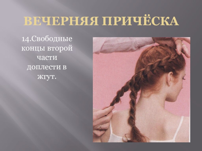 Вечерняя причёска14.Свободные концы второй части доплести в жгут.