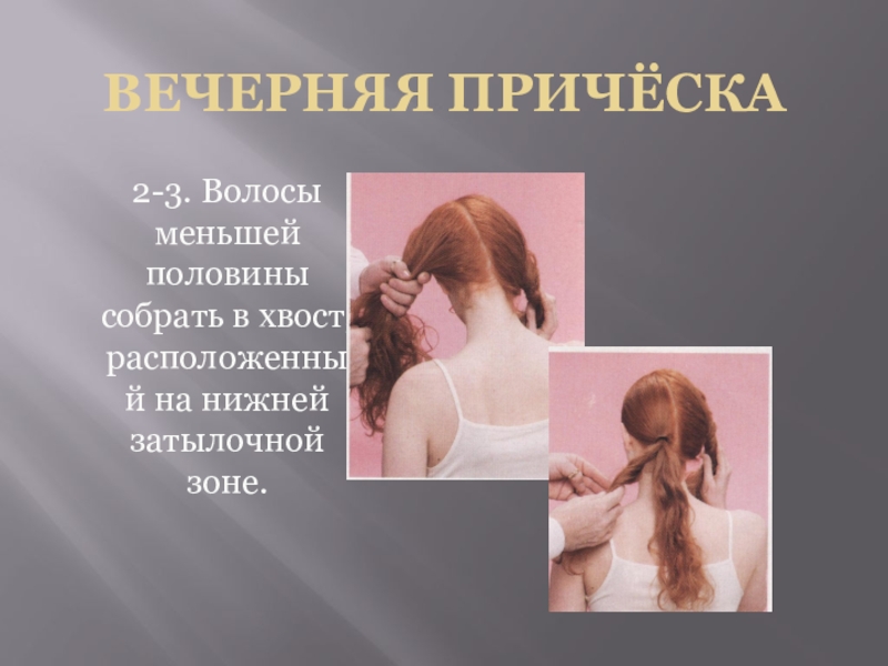 Вечерняя причёска2-3. Волосы меньшей половины собрать в хвост, расположенный на нижней затылочной зоне.