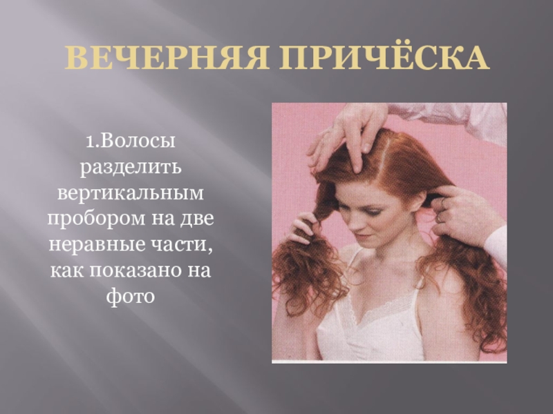 Вечерняя причёска1.Волосы разделить вертикальным пробором на две неравные части, как показано на фото