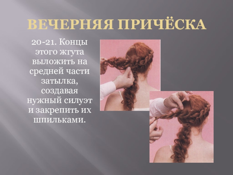 Вечерняя причёска20-21. Концы этого жгута выложить на средней части затылка, создавая нужный силуэт и закрепить их шпильками.