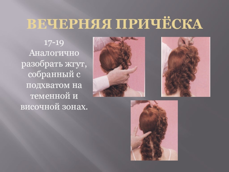 Вечерняя причёска17-19 Аналогично разобрать жгут, собранный с подхватом на теменной и височной зонах.