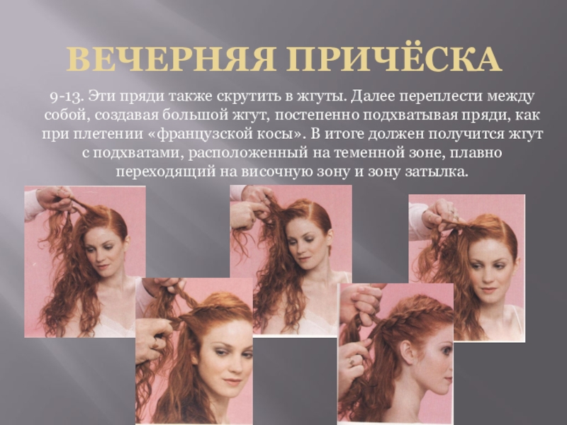 Вечерняя причёска9-13. Эти пряди также скрутить в жгуты. Далее переплести между собой, создавая большой жгут, постепенно подхватывая