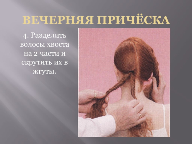 Вечерняя причёска4. Разделить волосы хвоста на 2 части и скрутить их в жгуты.