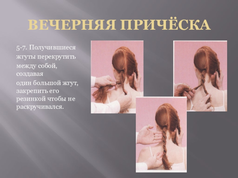 Вечерняя причёска5-7. Получившиеся жгуты перекрутить между собой, создавая один большой жгут, закрепить его резинкой чтобы не раскручивался.
