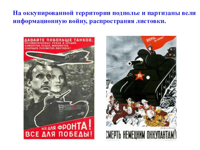 Слайд 10На оккупированной территории подполье и партизаны вели
