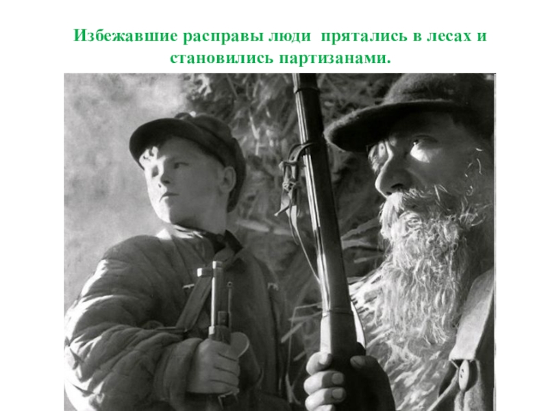Слайд 4Избежавшие расправы люди прятались в лесах и становились партизанами.
