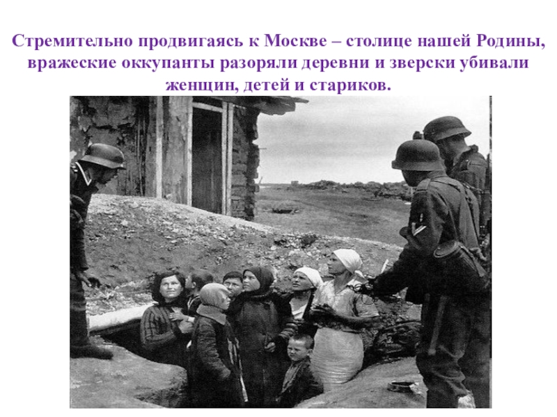 Слайд 3Стремительно продвигаясь к Москве – столице нашей Родины, вражеские оккупанты разоряли