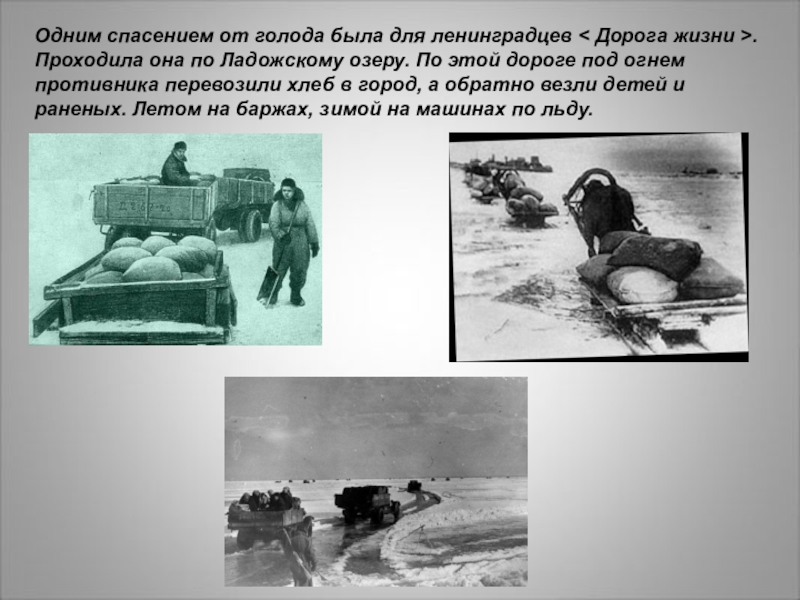 Проходила она по Ладожскому озеру. По этой дороге под огнем противника перевозили хлеб в город, а обратно везли детей и раненых. Летом на баржах, зимой на машинах по льду.