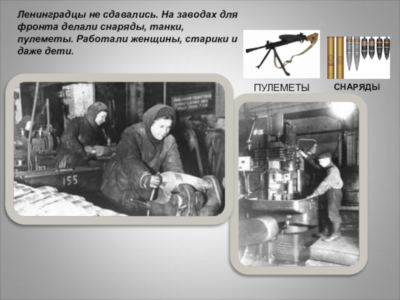 Слайд 14Ленинградцы не сдавались. На заводах для фронта делали снаряды, танки, пулеметы.